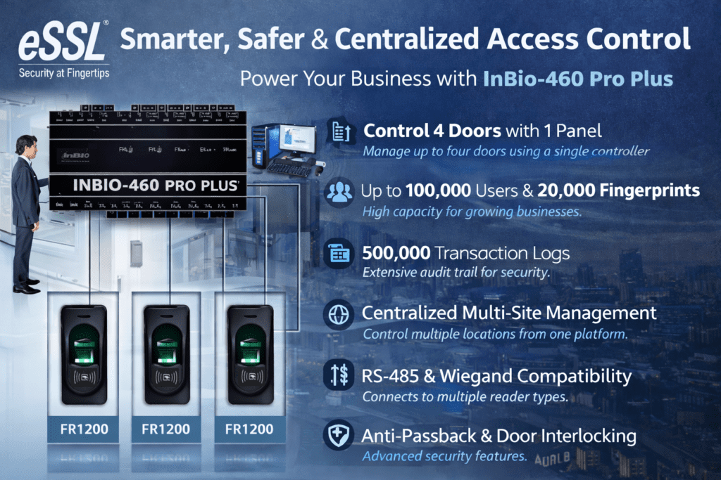 InBio-460 Pro Plus is a powerful 4-door access controller designed for secure, scalable, and enterprise-grade access control solutions. Built on a stable Linux operating system, it supports up to 100,000 card users, 20,000 fingerprint templates, and 500,000 transaction logs, making it ideal for medium to large organizations.